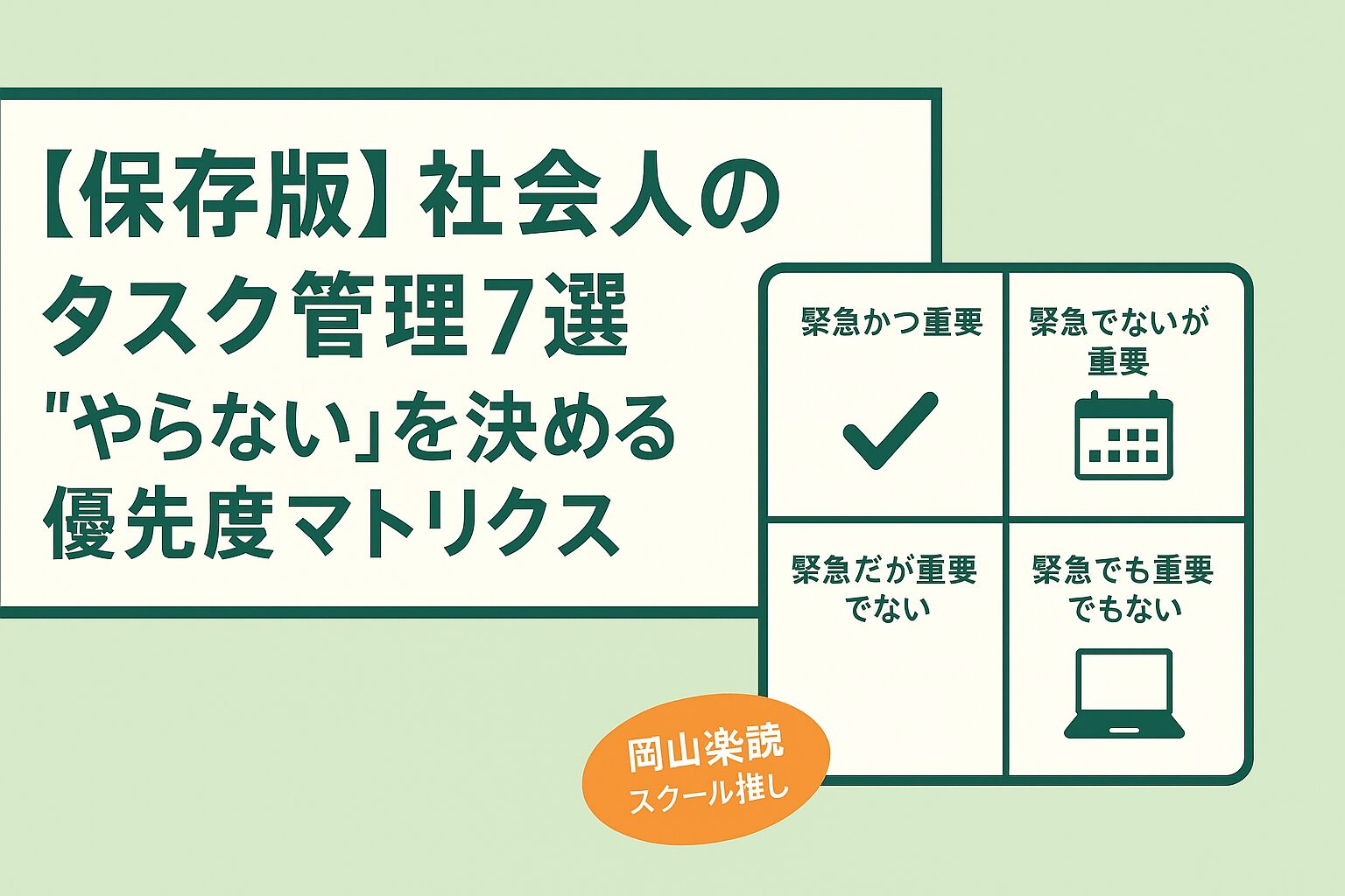 本記事では、社会人の現実にフィットするタスク管理の基本7ステップと、成果を左右する**「やらない」を決める優先度マトリクス(アイゼンハワー・マトリクス)を、明日から使える具体例つきで解説します。加えて、はじめてでも続けやすい最新のタスク管理ツールの選び方**も紹介。読了後には、今日の行動が“自動的に”決まっている状態をつくれます。残業とストレスを減らし、**本当に大事な仕事(第2領域)**へ時間を取り戻しましょう。